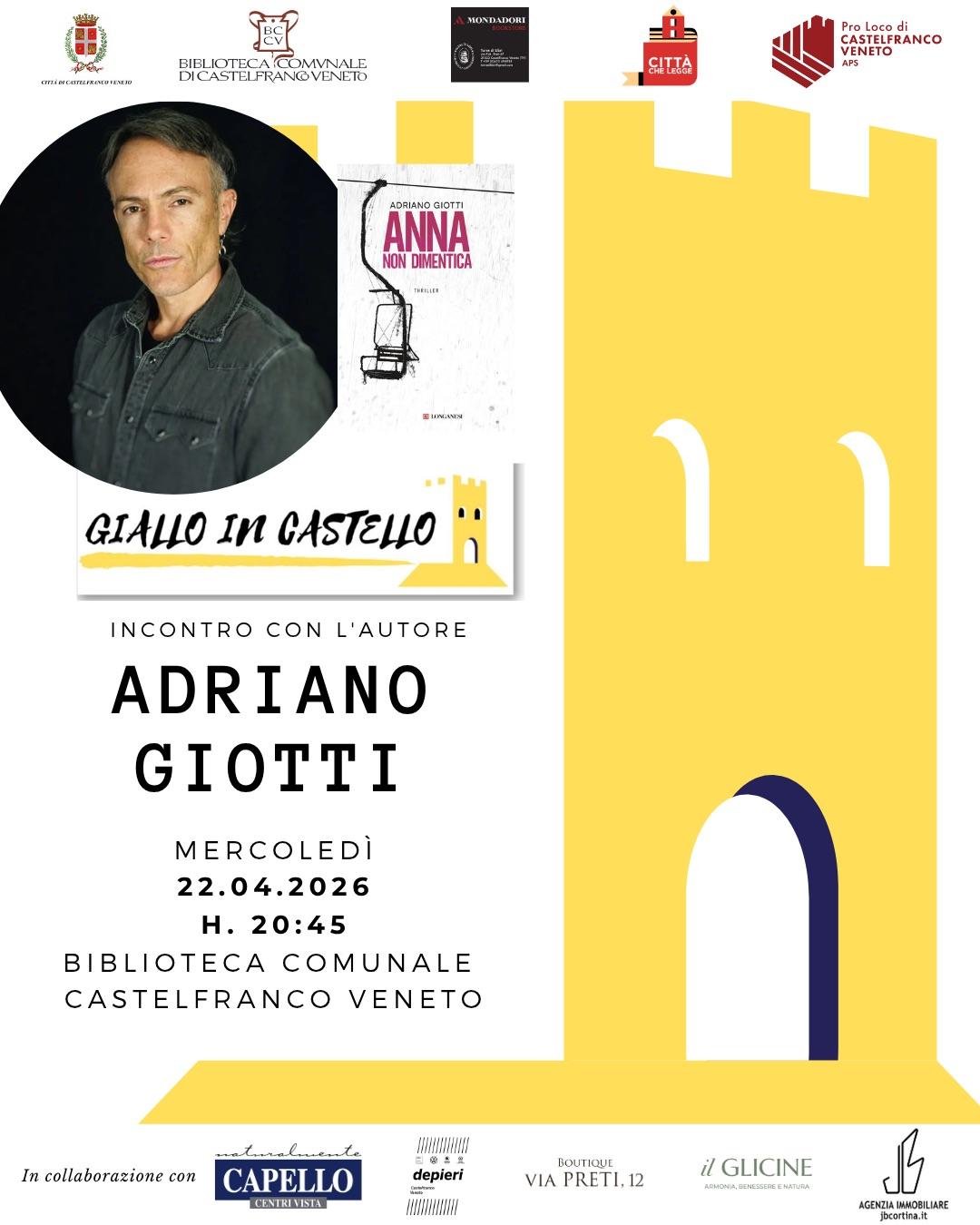 L'evento Giallo in Castello propone un incontro con l'autore Adriano Giotti, che si terrà mercoledì 22 aprile 2026 alle ore 20:45 presso la Biblioteca Comunale di Castelfranco Veneto.