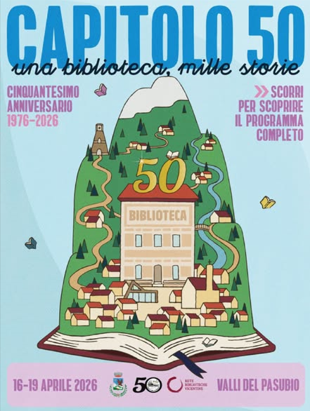 A partire da giovedì 16 aprile 2026 fino a domenica 19 aprile 2026, si potrà assistere a diverse attività proposte dalla Biblioteca Comunale di Valli del Pasubio in onore del suo Cinquantesimo Anniversario.