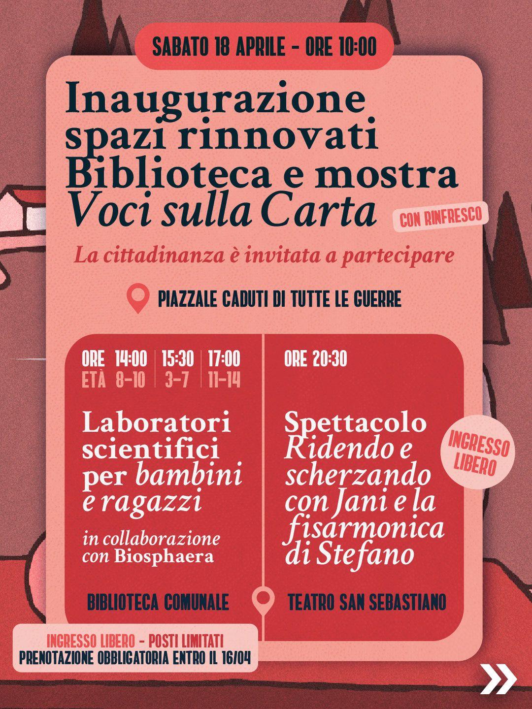 - Sabato 18 aprile dalle ore 10:00 "Inaugurazione spazi rinnovati Biblioteca e mostra Voci sulla Carta" con rinfresco