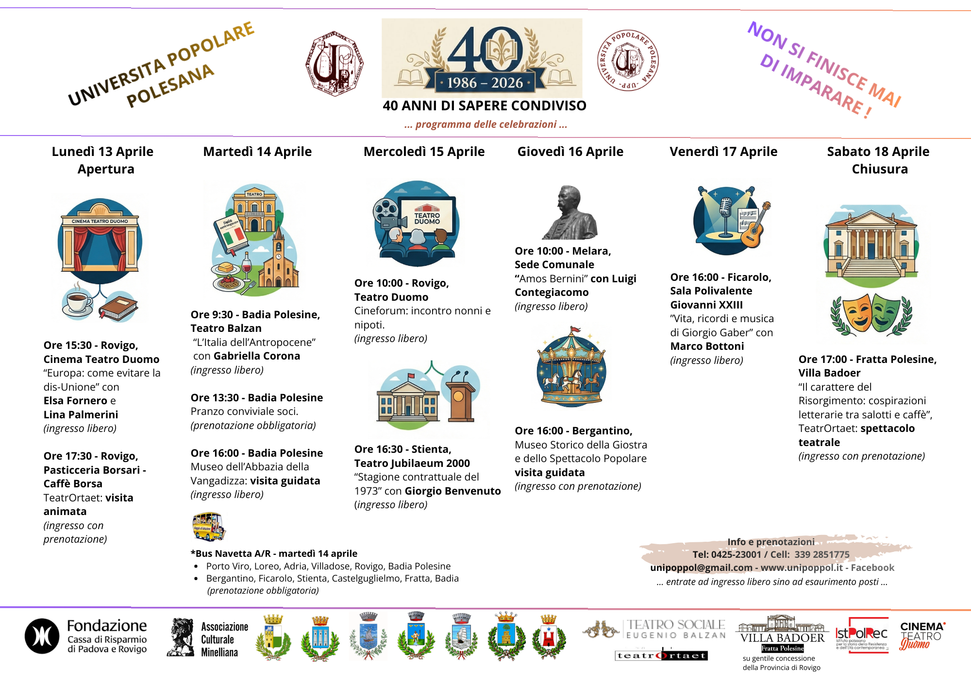 Ingresso con prenotazione e contributo info e prenotazioni Tel. 0425 23001 / Cell. 339 2851775 unipoppol@gmail.com