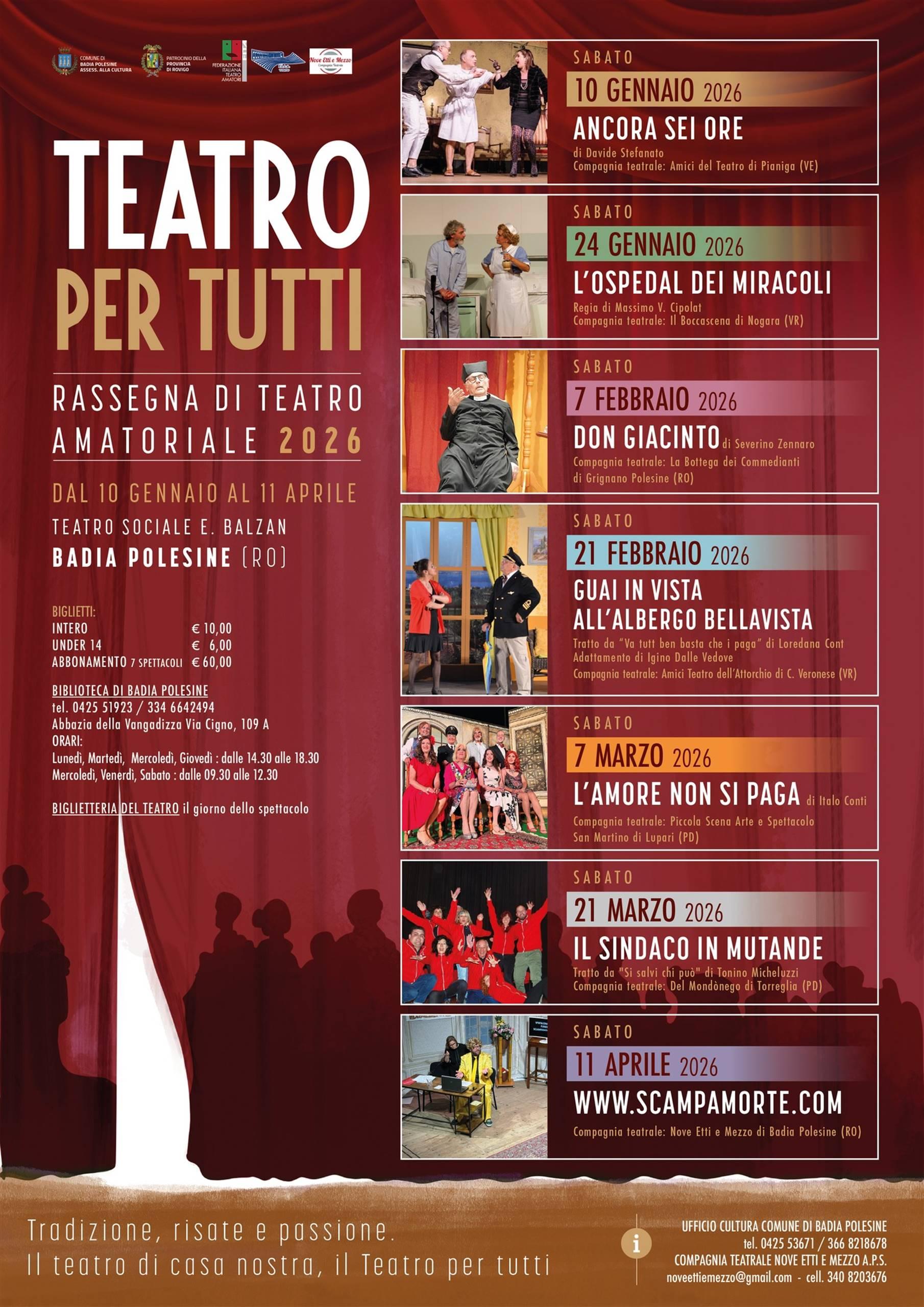 Il Comune di Badia Polesine, in collaborazione con il Teatro Sociale Balzan e con il supporto delle compagnie teatrali del territorio, annuncia la nuova edizione della rassegna “Teatro per Tutti” 2026, un calendario ricco di spettacoli amatoriali che animeranno i sabati da gennaio ad aprile 2026.
