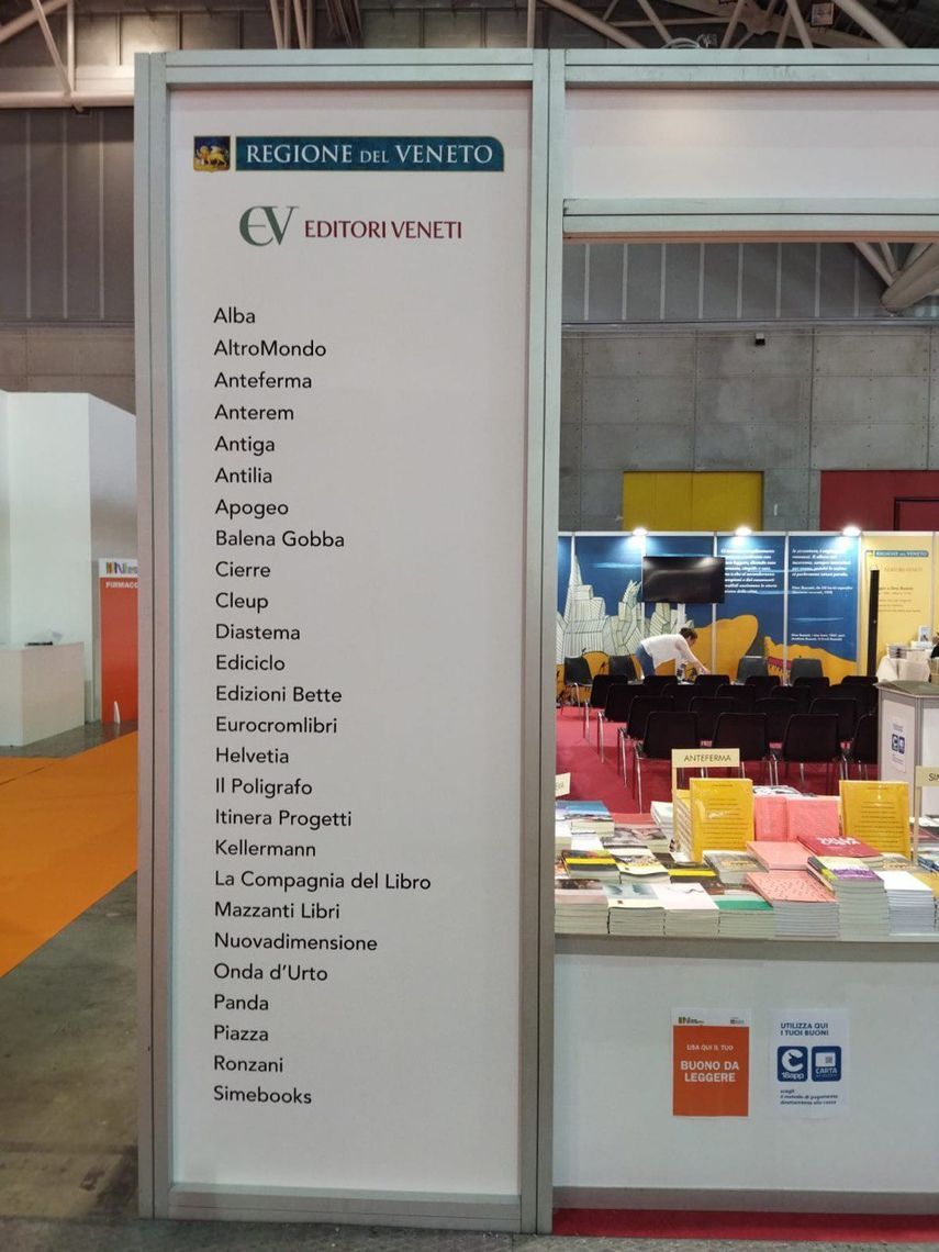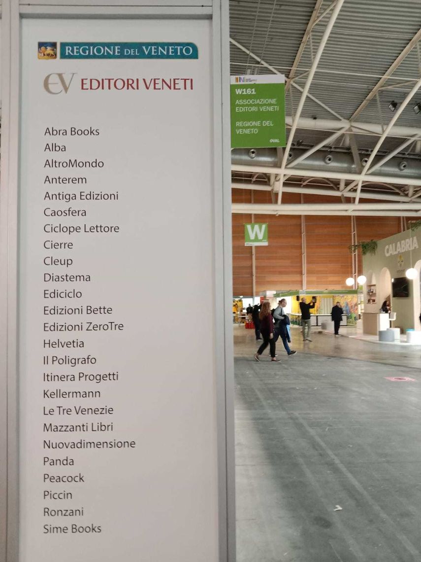 Lo stand istituzionale della Regione del Veneto e dell’Associazione Editori Veneti (Stand L25) ha ospitato 26 sigle editoriali venete, socie di AEV, che avranno a disposizione un proprio spazio espositivo. Saranno presenti le seguenti case editrici: Abrabooks, Alba, AltroMondo, Anteferma, Anterem, Antiga, Antilia, Apogeo, Balena Gobba, Cierre, Cleup, Diastema, Dielle, Ediciclo, Edizioni Bette, Helvetia, Il Poligrafo, Itinera Progetti, Kellermann, Le Tre Venezie, Mazzanti Libri, Nuovadimensione, Piazza, Piccin Nuova Libraria, Ronzani e Simebooks.