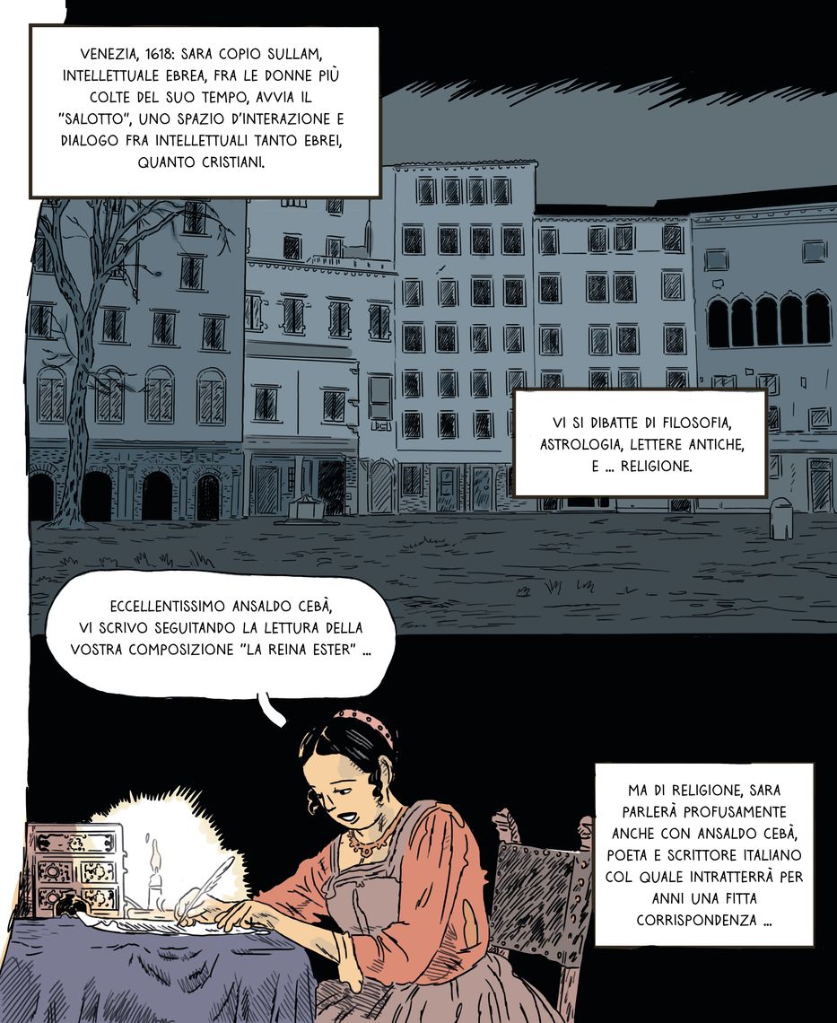 Nel 2025 sono protagoniste le tavole dell’artista BeneDì (Feltre, 1997) che fanno rivivere la vicenda della figura storica di Sara Copio Sullam. Nella prima metà XVII secolo, la sua casa nel Ghetto di Venezia divenne un circolo letterario aperto a ebrei e cristiani dove, sfidando i pregiudizi dell’ epoca, venivano dibattuti poesia, filosofia e religione. La rocambolesca vita di questa donna è testimonianza di come il Ghetto sia stato insieme luogo di segregazione e vivacissima fucina culturale, ricco di storie esemplari per il nostro presente.