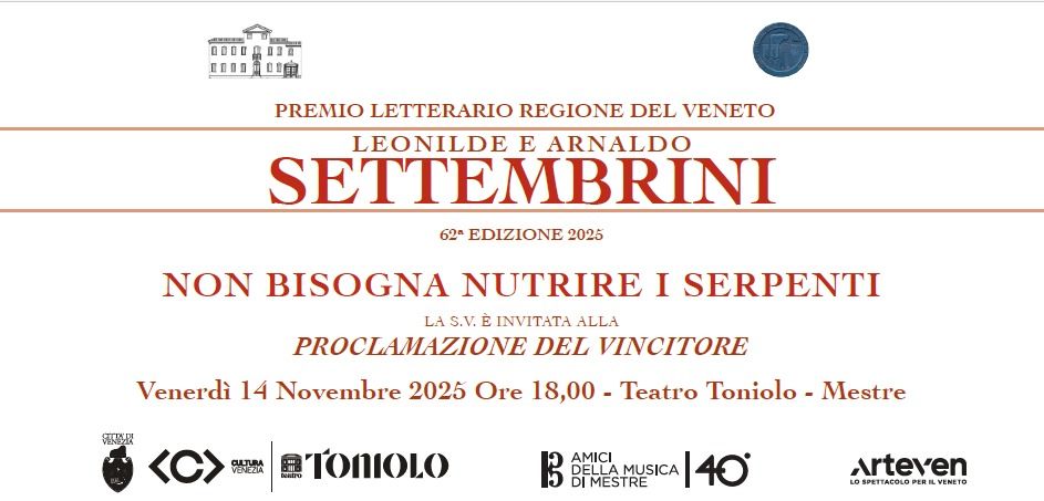 Venerdì 14 novembre il Teatro Toniolo di Mestre ospiterà la cerimonia di premiazione della 62° Premio letterario “Regione del Veneto - Leonilde e Arnaldo Settembrini - Mestre”, il riconoscimento dedicato ai soli racconti e novelle in lingua italiana, nato nel 1959 per volontà di Arnaldo Settembrini, in memoria della moglie Leonilde Castellani Settembrini.
