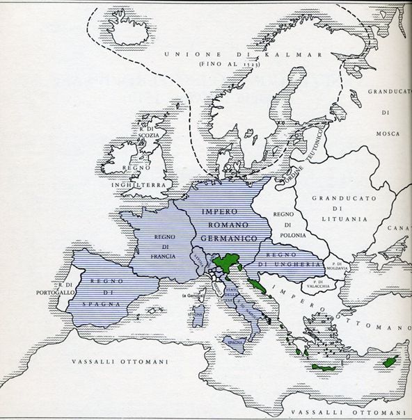 Dopo di che, la caduta di Costantinopoli in mano turca (1453) e la conseguente pace di Lodi (1454) costringono i maggiori Stati italiani alla “politica dell’equilibrio”, anche se la Serenissima di tanto in tanto ne evade le clausole annettendosi il Polesine (1484), i porti pugliesi (1495) e Cremona (1499), infine Trieste e Fiume (1508), in seguito alla trionfale cavalcata in Cadore di Bartolomeo d’Alviano.