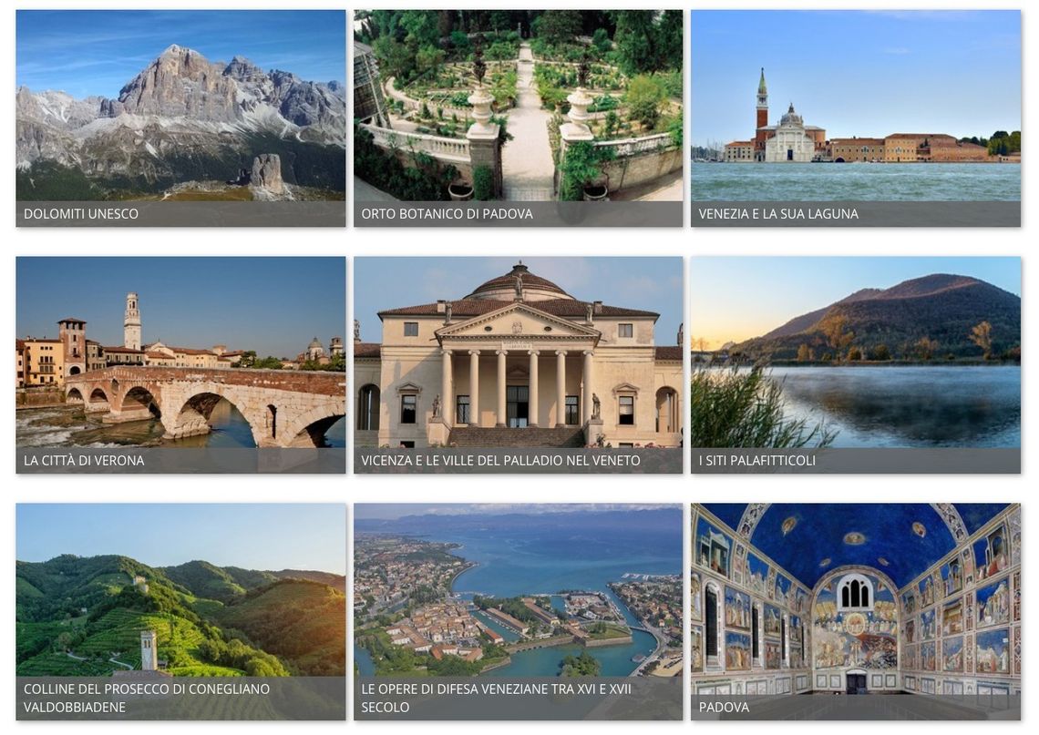Il Veneto è tra le Regioni d'Italia maggiormente rappresentate nella Lista del Patrimonio Mondiale Unesco (World Heritage List) con 6 siti collocati interamente nel proprio territorio e 3 siti che vi ricadono in parte.