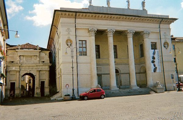 La costruzione del nuovo teatro fu determinata dalla demolizione del Palazzo del Consiglio dei Nobili, detto della "Caminada", nella cui grande stanza del piano superiore, originariamente deposito delle armi cittadine, poi trasferite al Castello, si erano svolti, fin dal '500, tutti gli intrattenimenti teatrali.