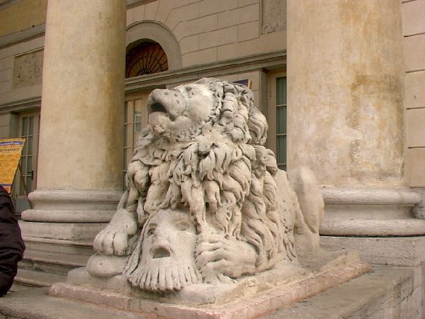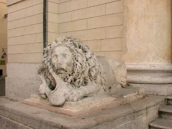 Di stile neoclassico, la facciata presenta quattro poderose colonne corinzie; alla base è situata la comoda e breve gradinata affiancata da due blocchi in pietra sormontati da due leoni scolpiti da Pietro Zandomeneghi figlio, i quali secondo il Miari rappresentano