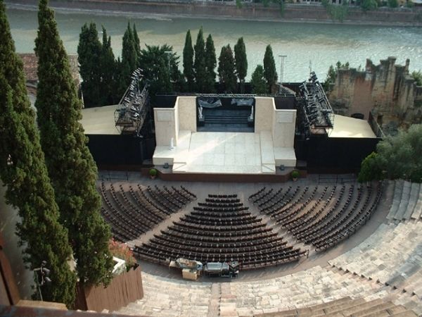 E’ stato costruito nell’ultimo quarto del I secolo a.C., ai piedi del Colle di San Pietro. Il cantiere del Teatro restò aperto per alcuni decenni, com'era naturale data la grandiosità dell'edificio. I pochi ruderi oggi visibili non sono certamente in grado di documentarne l'antico splendore. Nel corso del tempo, il manufatto subì l’ingiuria del tempo, dei cataclismi e giacque per secoli interamente sepolto sotto miserabili casupole. Fu solo intorno al 1830 che il veronese Andrea Monga acquistò a sue spese queste casupole e le fece abbattere, dando inizio ai lavori per riportare in luce quanto rimaneva dell’antico edificio. Ora, del teatro antico rimane la cavea e la gradinata, alcune arcate di logge e significativi resti della scena. Un ampio restauro fu eseguito agli inizi del secolo XX. A fianco del teatro sta il convento rinascimentale di San Gerolamo, che ospita il Museo Archeologico ed offre un’affascinante vista sul fiume e sulla città.