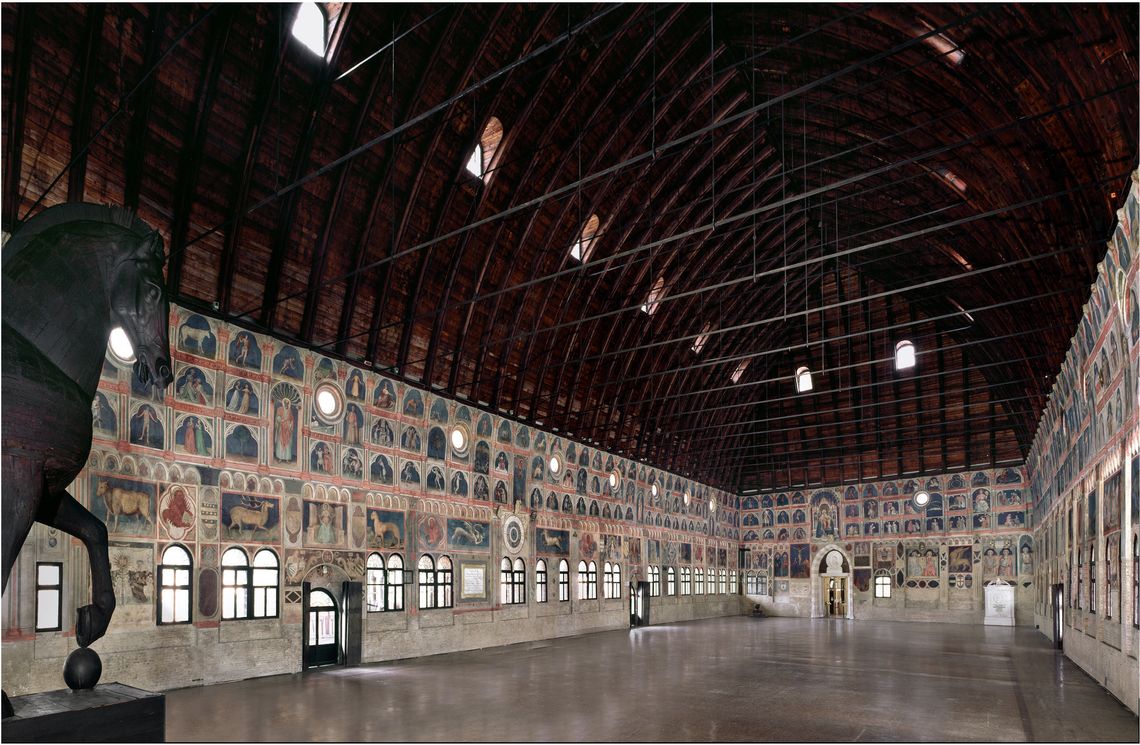 A cavallo del primo decennio del trecento a Giotto e bottega viene affidato il compito di affrescare le pareti della grande sala, il ciclo però fu distrutto dall'incendio che nel 1420 mandò in cenere l'archivio dei Carraresi.