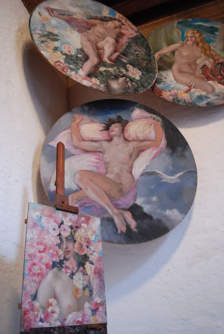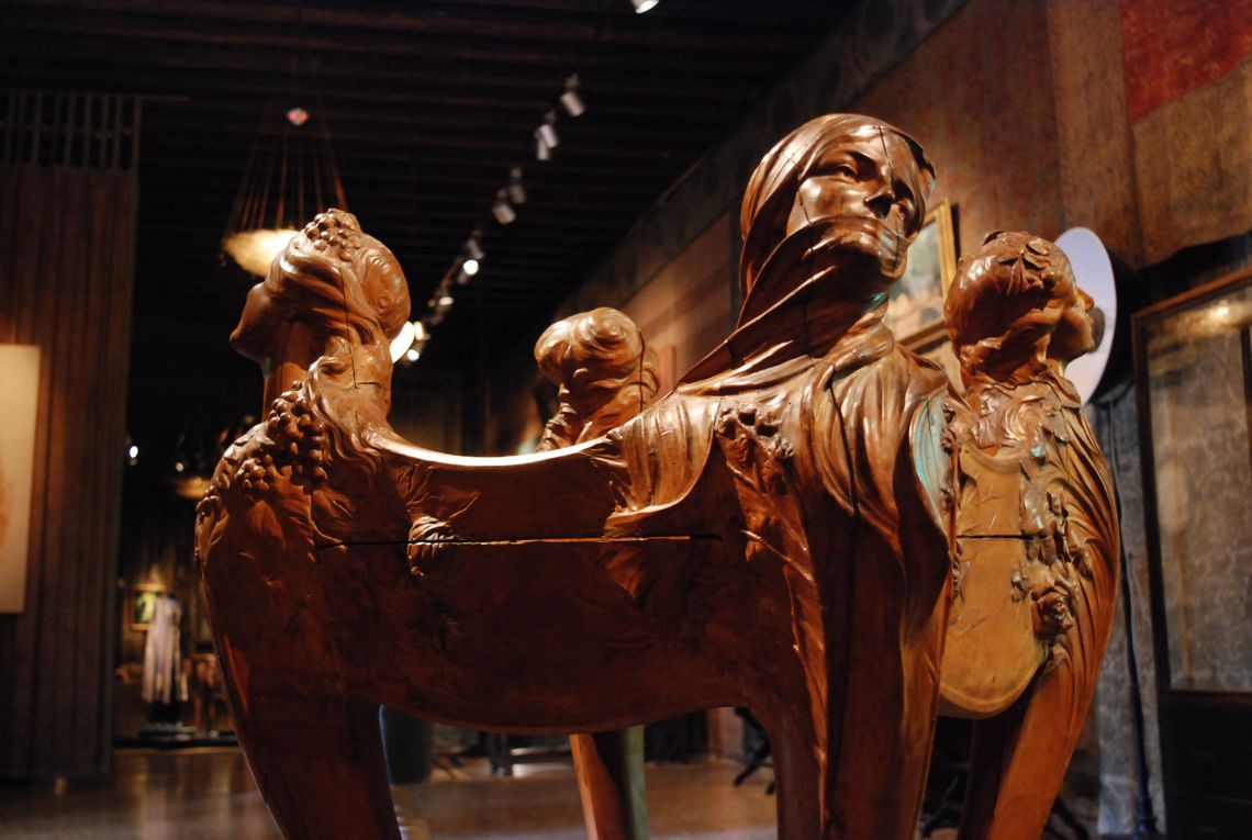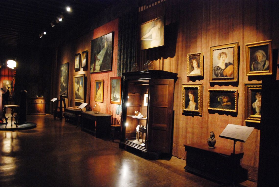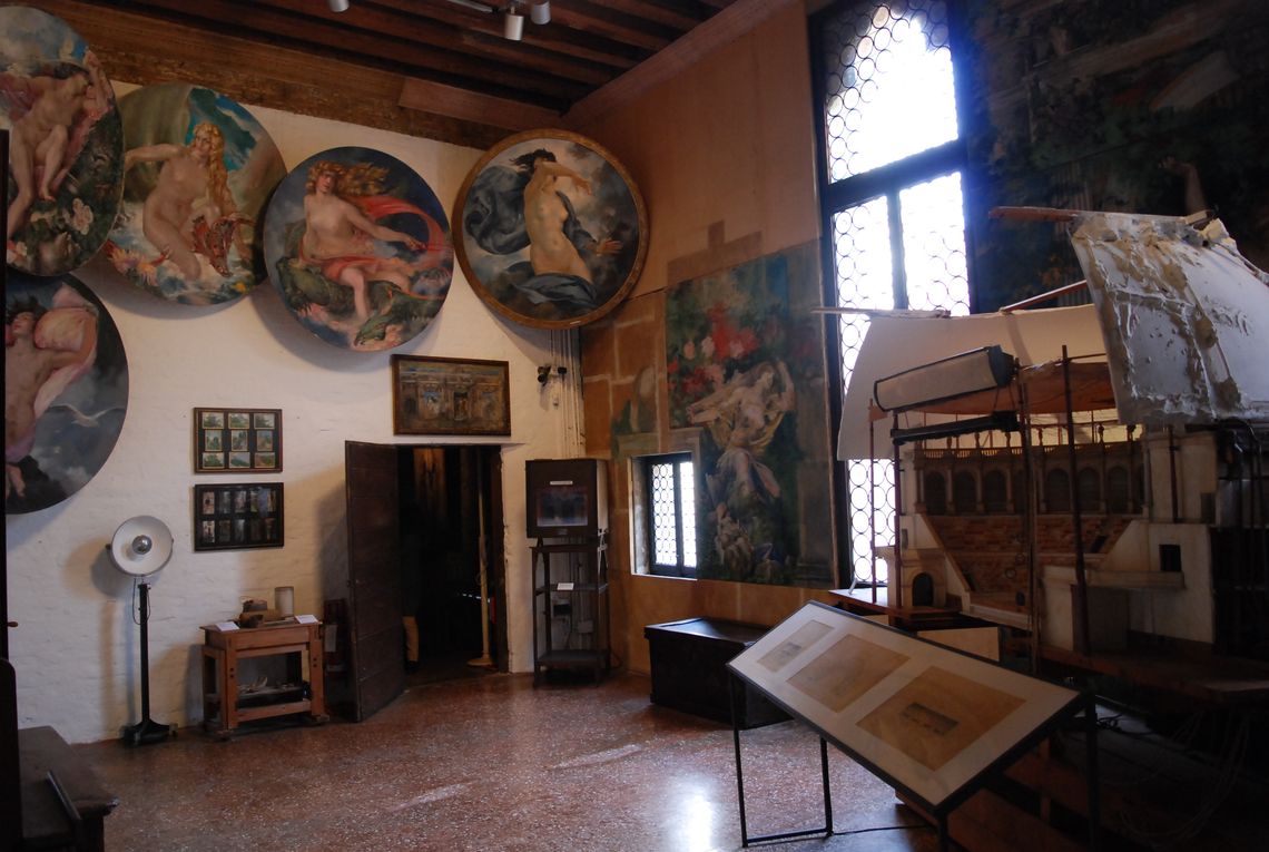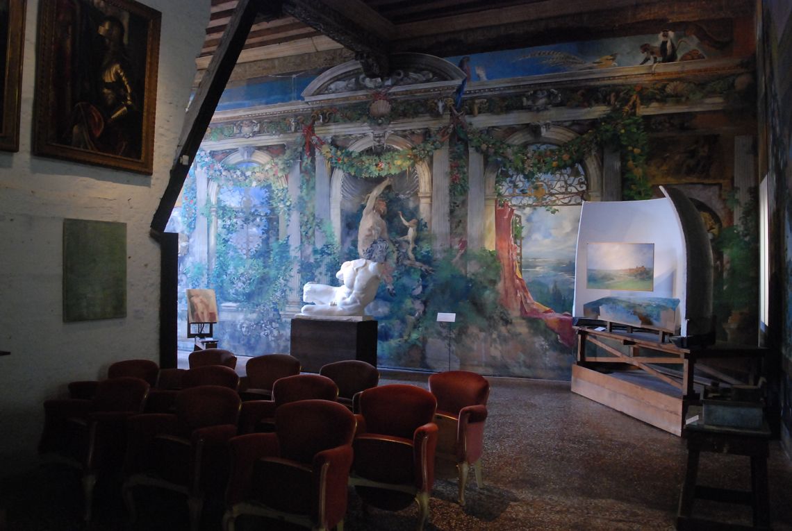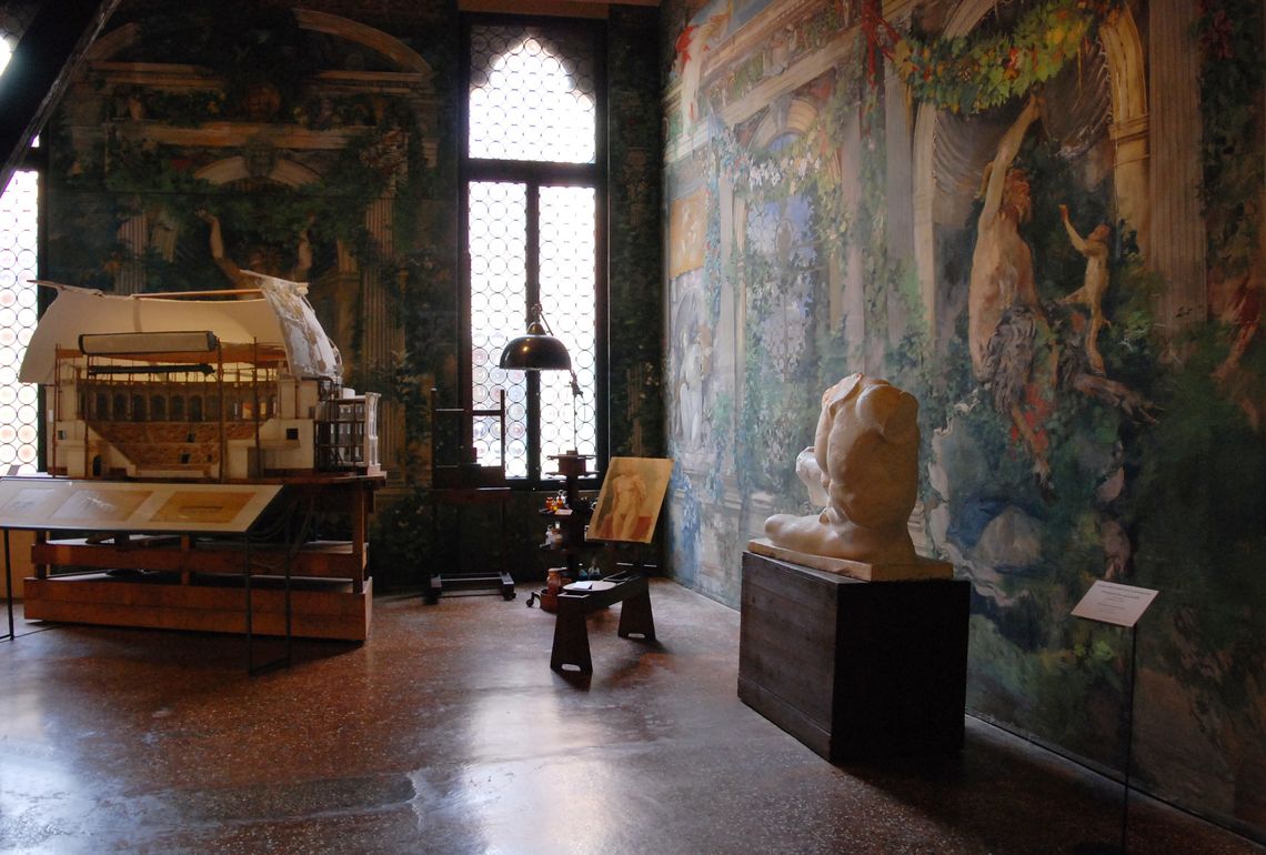 Il salone del primo piano conserva intatte le caratteristiche di ciò che fu lo studio di Mariano Fortuny. Preziosi tessuti in velluto di seta e cotone rivestono interamente le pareti. Lo spazio, strutturato in quinte teatrali, accoglie una ricca collezione di opere e oggetti che ben testimonia i diversi campi di indagine e sperimentazione in cui Fortuny si cimentò: dipinti, fotografie, disegni, incisioni, sculture, lampade tecniche e per l’arredo, modelli teatrali, tessuti stampati e abiti, dai celebri Delphos ai costumi teatrali. Tutto è testimonianza della geniale ispirazione di questo artista tra sperimentazione e innovazione, tutto è testimonianza della sua presenza sulla scena intellettuale e artistica internazionale a cavallo tra Ottocento e Novecento.