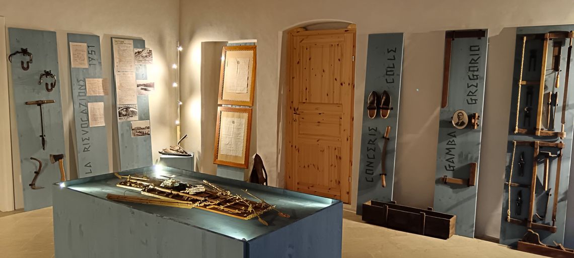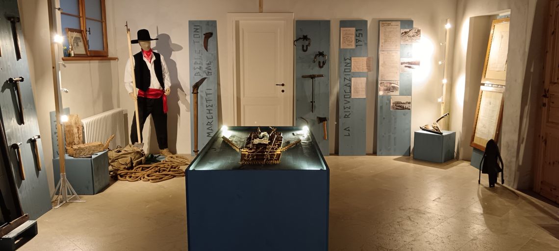 Della famiglia Marchetti, “Zattari del Sobborgo di San Nicolò della Piave” almeno dal 1663, sono visibili anche l’anger, il zapin, il sogàt, l’abito con il tipico cappello con la falda larga, utile per far cadere la pioggia all’esterno delle spalle durante il viaggio in zattera, e poi ancora i martelli con i quali le Segherie Collarin, poi Bellunesi, che avevano la sede proprio a Borgo Piave in riva al fiume, marchiavano nei boschi gli alberi di proprietà ma anche fotografie che mostrano il borgo con le zattere, la rievocazione storica del 1951, partita proprio dalle segherie del borgo ed altri elementi identitari di Borgo Piave come le tipiche pialle da serramenti e mobili di Gregorio Gamba “Marangon di Piave” e altri attrezzi provengono invece dalla collezione di Fioretto Bortot, Ivano Caviola ed Enzo Marcer."