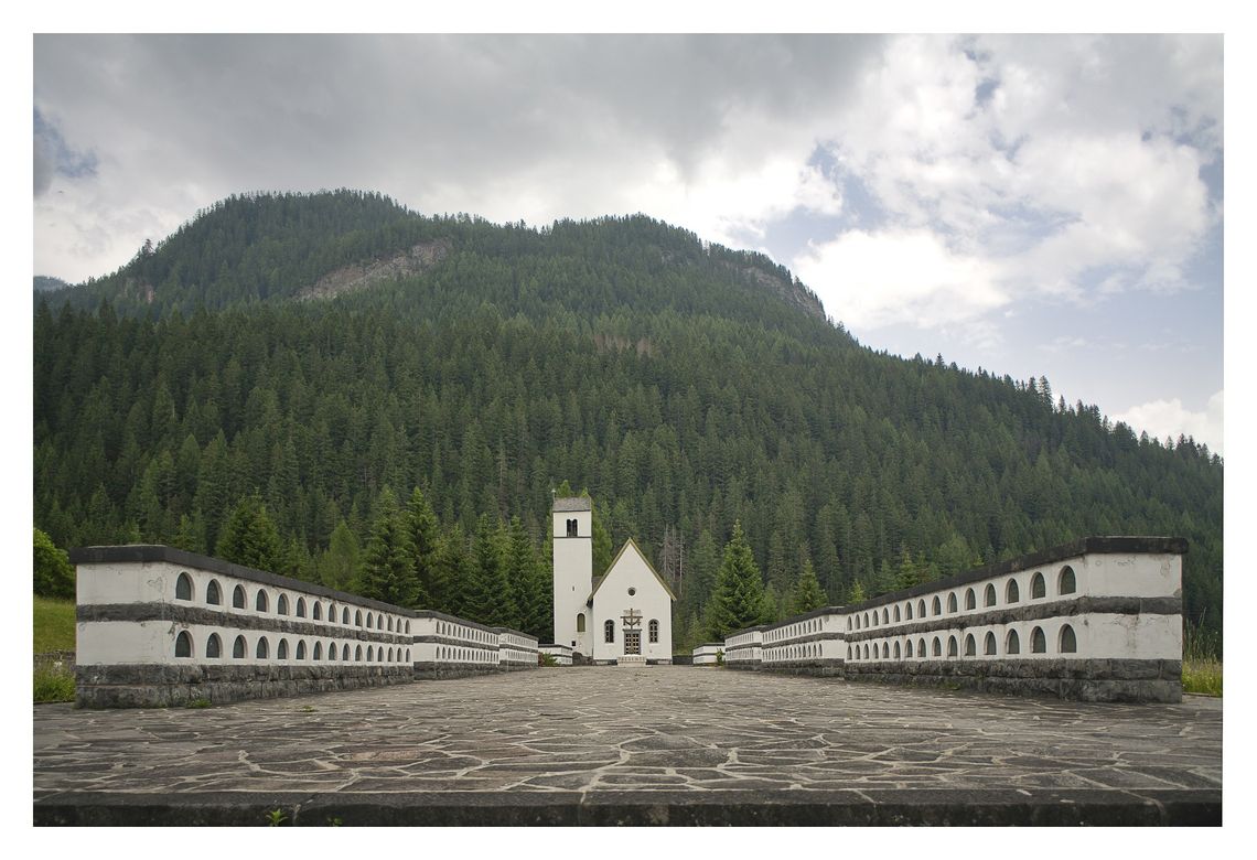 L’opera insiste su un’area di sepoltura consacrata sedici anni prima, ai piedi del Col di Lana, il monte tristemente noto come “Col di Sangue”, teatro di tragici combattimenti, nel cuore delle Dolomiti bellunesi, e si sviluppa sullo spazio antistante una chiesetta preesistente.Il percorso del viale d’accesso è scandito ai lati da 14 monoliti, ciascuno dedicato a una grande battaglia del conflitto. La costruzione, con pianta a croce latina, è caratterizzata dall’incrocio di spallette parallele in muratura, in cui sono allineati, su file sovrapposte, i loculi ‘a colombario’, come sul Grappa, chiusi da lastre di marmo verde. Vi riposano i resti di 704 caduti noti, tra cui 19 austroungarici, e 4.705 caduti rimasti senza nome. Il fulcro è segnato da una croce, sul cui basamento si legge l’iscrizione «Presente», richiamo a un altro, ben più celebre sacrario, quello di Redipuglia in provincia di Gorizia, non a caso dovuto agli stessi progettisti e inaugurato lo stesso anno. Il complesso è pensato con una particolare funzione scenografica, fruibile dalla soprastante strada, in una veduta quasi ‘aerea’, che incornicia il monumento tra i verdi declivi della vallata, cui fa da fondale d’eccezione la straordinaria parete nord del Civetta, uno dei più suggestivi scorci dolomitici.