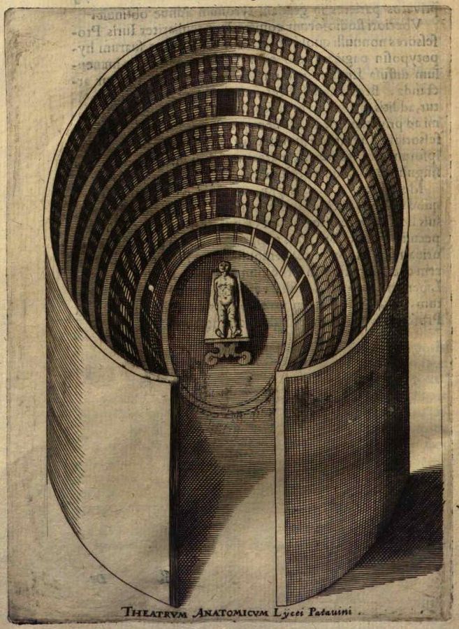 Nel 1594 il medico Girolamo Fabrici d’Acquapendente dispone la costruzione di un teatro anatomico stabile: è la prima struttura permanente realizzata per l’insegnamento dell’anatomia mediante la dissezione di cadaveri.