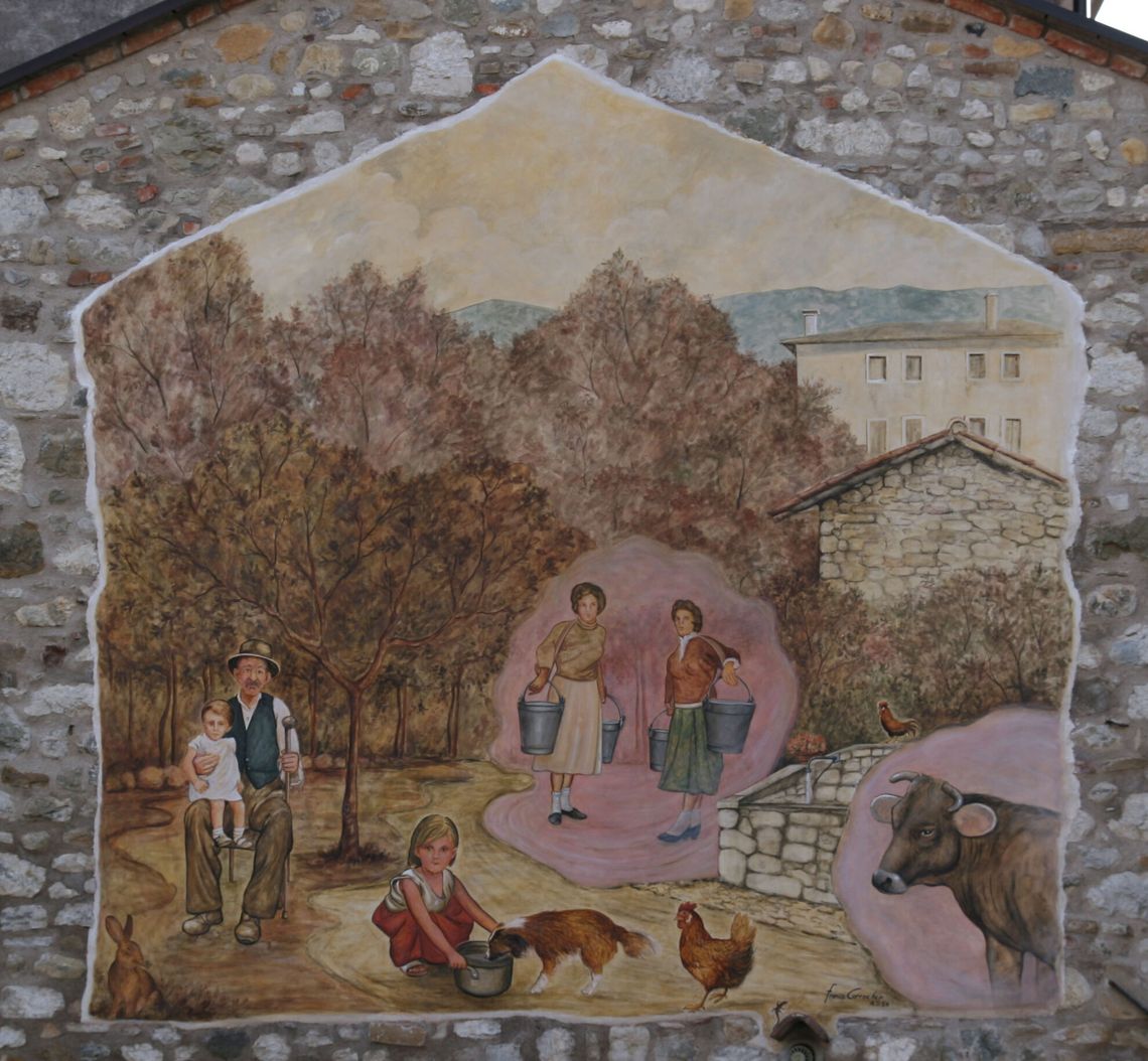 Opera di Franco Corrocher, rappresenta uno scorcio del paese dove si trova ancora la fontana raffigurata nel murale. I volti dei protagonisti sono tratti da fotografie dei residenti. L'autore ha voluto raccontare come l'acqua nei paesi fosse punto di incontro per riempire i secchi ed abbeverare gli animali.