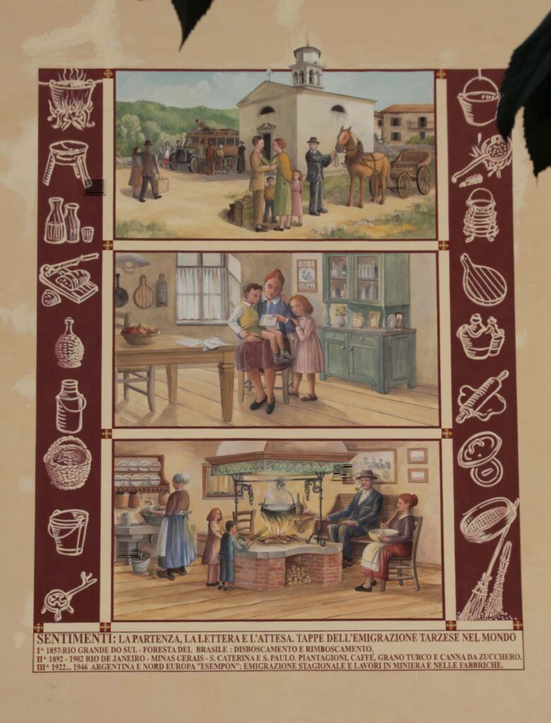 Opera di Gabriele Cattarin, rappresenta in tre riquadri: la partenza quindi il distacco dalla famiglia, la lettera dall’estero, unico mezzo di comunicazione all'epoca e l’attesa del ritorno. Il fenomeno dell'emigrazione ha radici anche in questi luoghi da cui partirono molte persone verso il Brasile, l'Argentina e altre destinazioni.