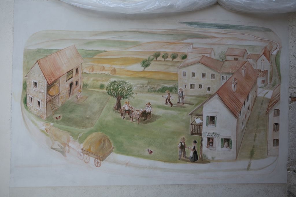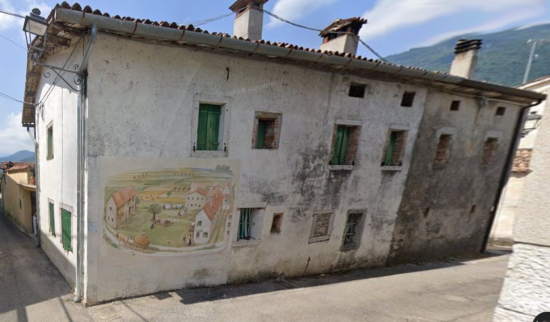 Opera di Maria Teresa Casagrande, rappresenta il cortile dove si ritrovavano i contadini che tornavano dal lavoro dei campi e i viaggiatori di passaggio. Luogo di incontro e di ristoro gestito dalla nonna dell'autrice rappresentata nel murale, affacciata alla finestra.