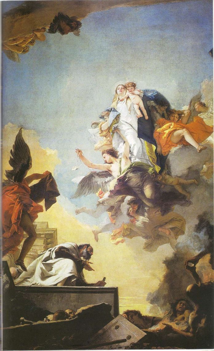 A Giambattista Tiepolo, noto per la velocità esecutiva, furono commissionati, dapprima gli scomparti laterali e poi, nel 1739, l’intera decorazione della sala principale che terminò dieci anni dopo con il dipinto della tela centrale.