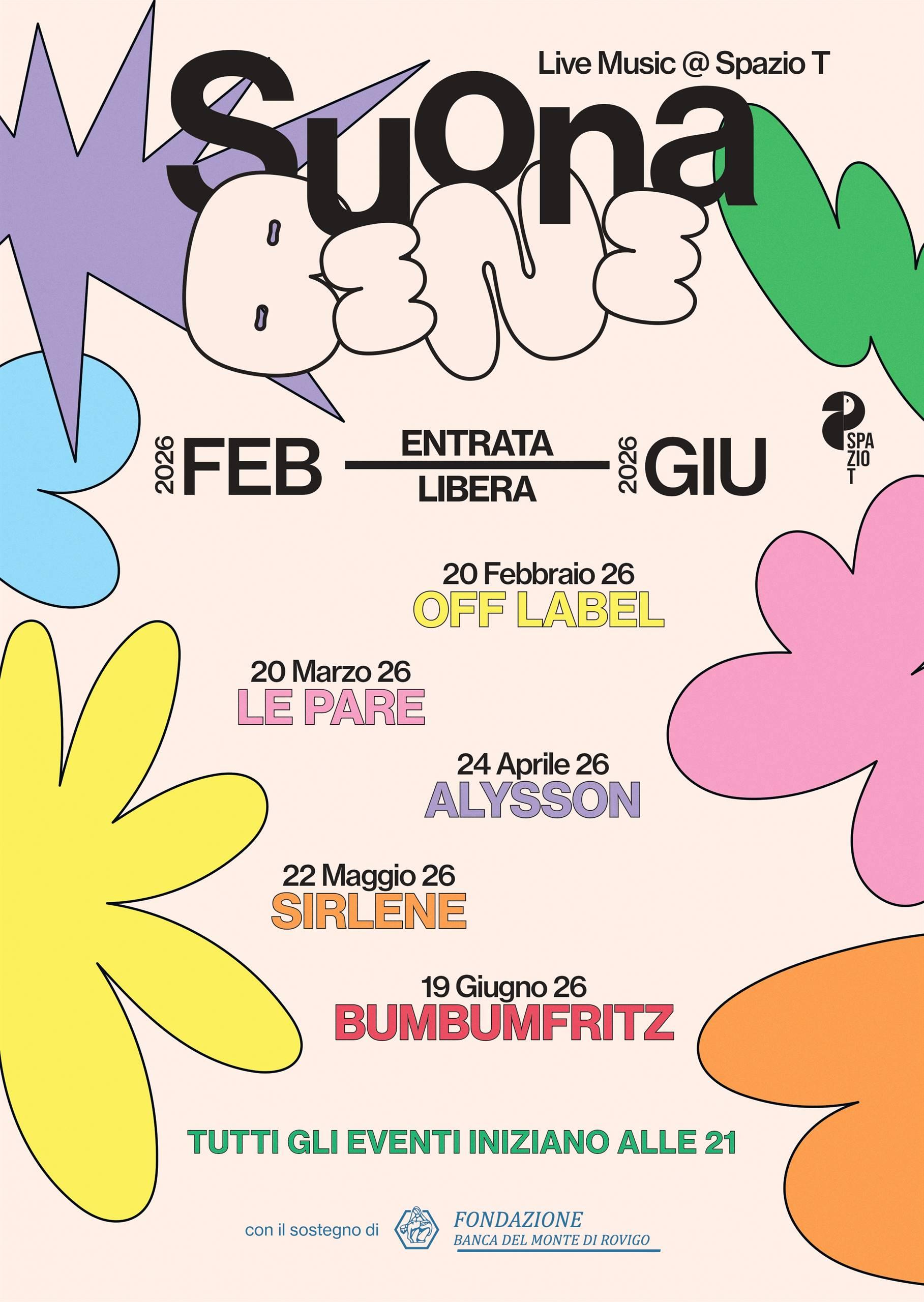 Ogni mese si esibirà una band o un artista diverso, scelti nel panorama locale e non solo. Il 20 febbraio arrivano gli Off Label, duo in cui pop, grunge e metal si fondono in un repertorio di musica acustica. Sono formati da Mirko Brundu (voce, chitarra, basso) e Matteo Franceschetti (chitarra e basso): il primo proviene da band quali Breadstix, Reggatta, Love & Trust e fa parte del roster della Night of Guitars. Il secondo si è esibito per anni come chitarrista solista al Ferrara Buskers Festival e con Brundu condivide il progetto Love & Trust, portando la musica dei Pearl Jam tra Padova, Vicenza e Treviso.