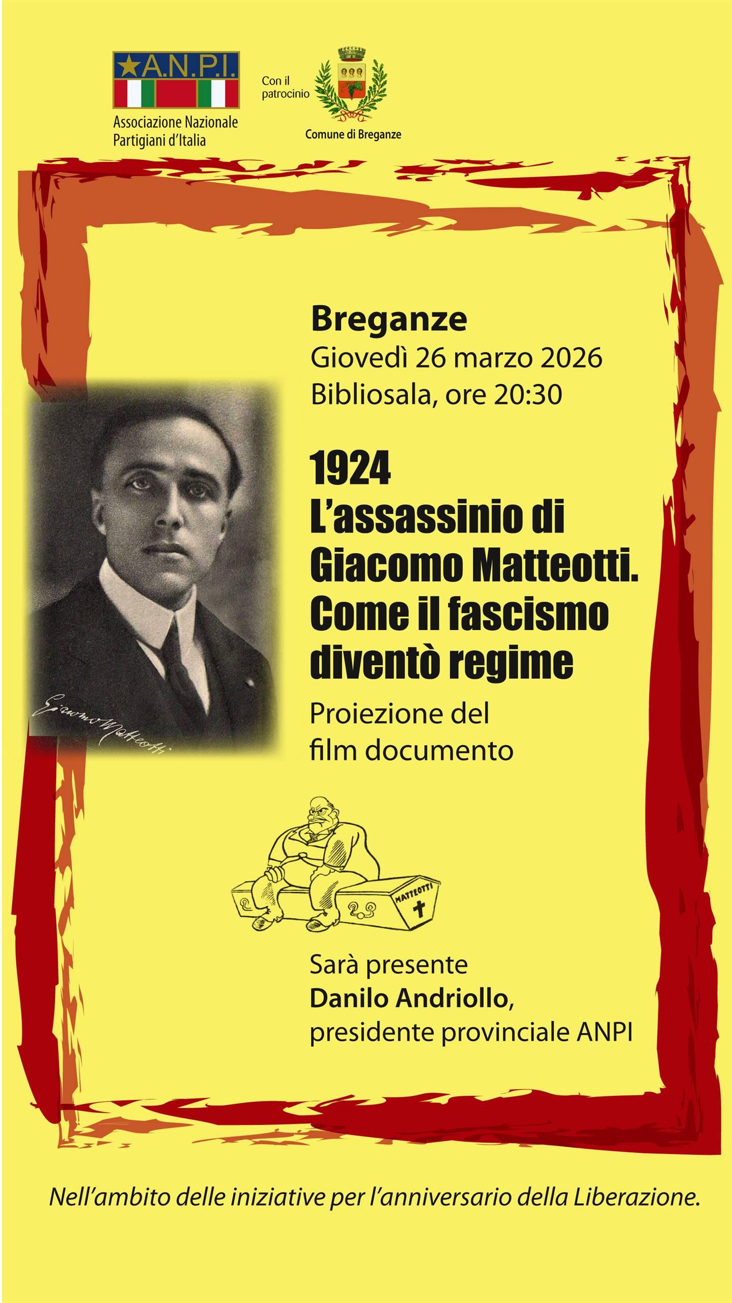 Giovedì 26 marzo 2026 alle 20:30 presso la Bibliosala di Breganze si terrà "1924: L'assassinio di Giacomo Matteotti. Come il fascismo diventò regime".