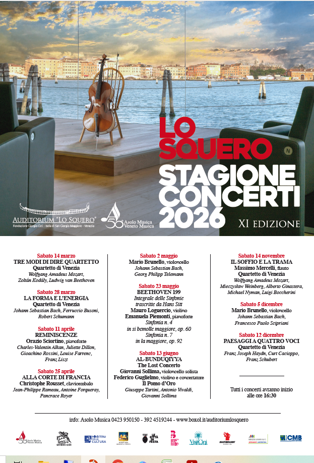 Un originale percorso tra forme musicali pure, rielaborazioni innovative: sabato 14 marzo prende il via l’undicesima stagione concertistica promossa da Asolo Musica Veneto Musica nell’incantevole cornice dell’Auditorium Lo Squero, realizzato da Fondazione Giorgio Cini sull’isola di San Giorgio Maggiore a Venezia. Dieci concerti affidati a grandi nomi del panorama nazionale e internazionale, tutti di sabato pomeriggio, scandiscono fino al 12 dicembre il variegato cartellone 2026, alla ricerca di colori, emozioni, suggestioni e nuovi mondi sonori. Una rassegna, inserita nel palinsesto de “Le Città in Festa”, un programma eterogeneo di eventi, manifestazioni e iniziative che si svolgono su tutto il territorio comunale Veneziano.