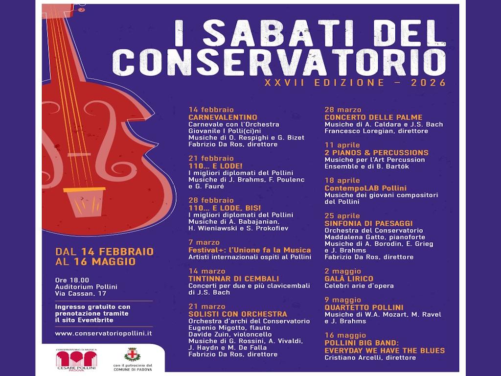 Il Conservatorio Cesare Pollini di Padova organizza la XXVII edizione della rassegna "I Sabati del Conservatorio". Docenti, studenti e studentesse del Conservatorio portano in scena le migliori produzioni dell'Istituto, interpretando repertori che spaziano dalla musica classica al jazz, passando per la musica sacra e la lirica.
