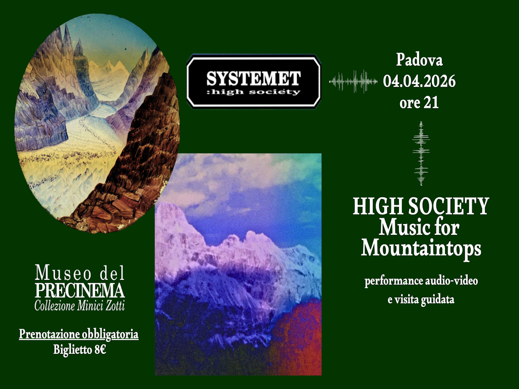 Sabato 4 aprile, a partire dalle ore 21, il Museo del Precinema ospiterà un evento diverso da ciò a cui ha abituato il proprio pubblico: la performance di Systemet (Eugenio Paganelli) intitolata High Society: Music for Mountaintops, un concerto di musica elettronica sperimentale accompagnato dalle videoproiezioni di riprese montane elaborate dall'artista visivo Gabriele Marchina.