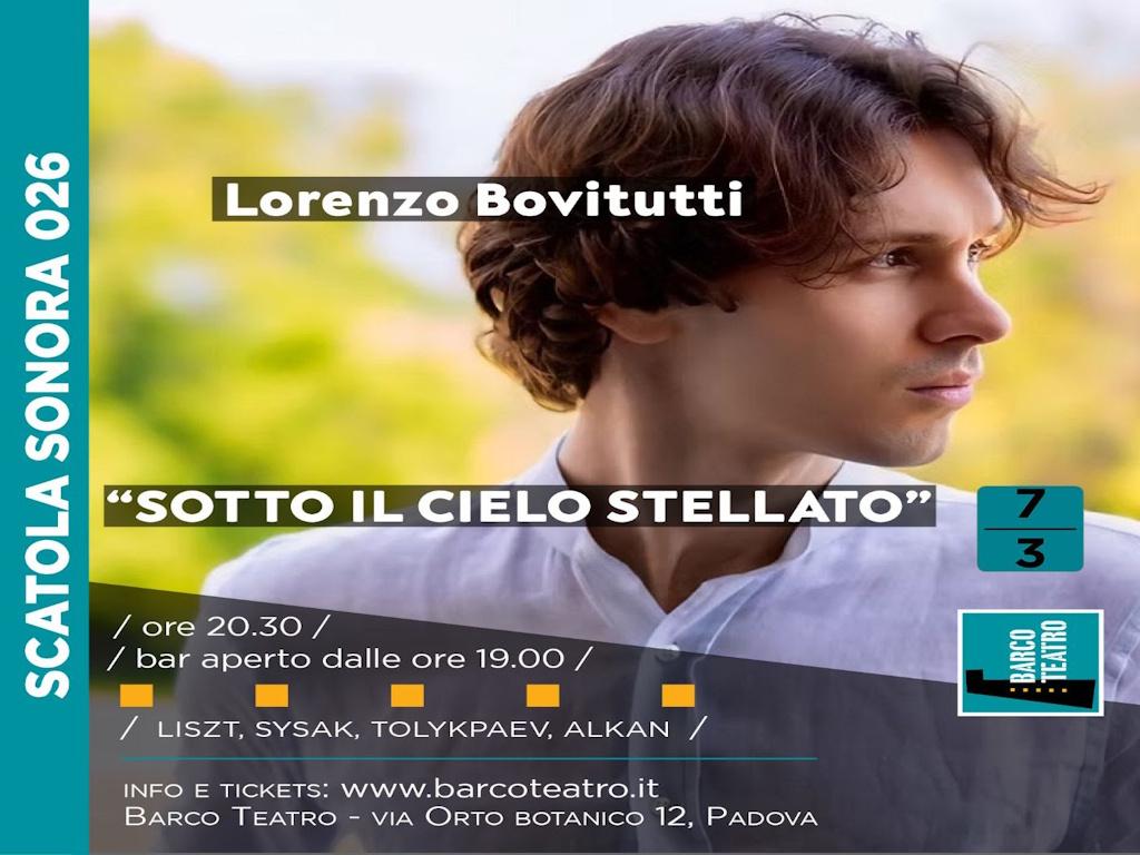 Barco Teatro presenta al suo pubblico Lorenzo Bovitutti, un giovane interessantissimo talento del pianoforte in un recital che sostituisce quello programmato di Flavia Salemme per la data (ritroveremo Flavia nel programma della prossima stagione). Entrambi questi giovani pianisti si sono perfezionati presso l'Accademia Musicale di Pinerolo, fucina di giovani talenti con la quale Barco Teatro ha iniziato una feconda collaborazione.