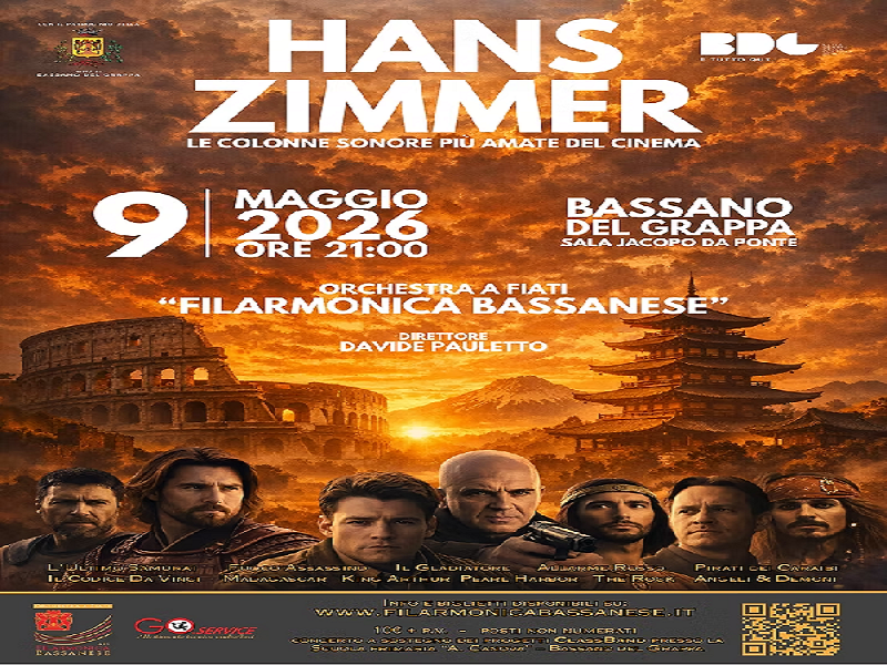 Sabato 9 maggio 2026, alle ore 21:00, presso la Sala Jacopo Da Ponte di Bassano del Grappa, l’Orchestra a Fiati della Filarmonica Bassanese, diretta dal Maestro Davide Pauletto, accompagnerà il pubblico in un viaggio sonoro attraverso le musiche più celebri di Hans Zimmer.