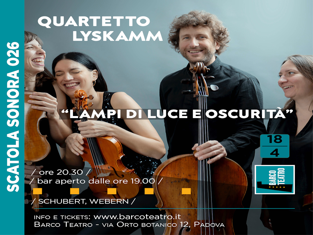 Il Quartetto Lyskamm, formazione italiana con una importante attività concertistica in ambito internazionale, vincitore di prestigiosi premi e riconoscimenti, approda sul palco del Barco con un programma molto intenso, carico di emozioni e liriche sonorità.
