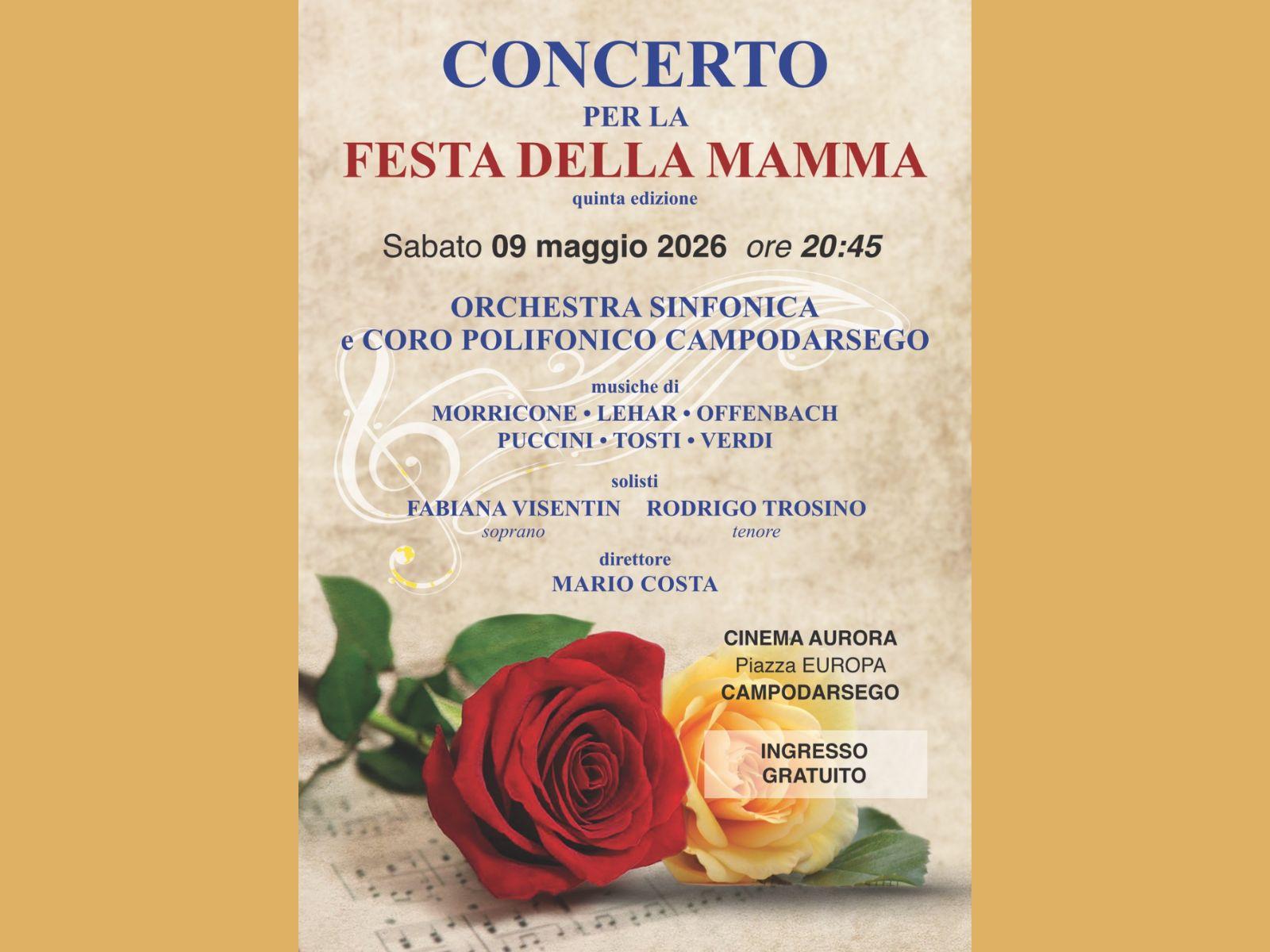 Sabato 9 maggio, alle 20:45, presso il Teatro Aurora, ritorna il Concerto per la festa della mamma. L'Orchestra sinfonica e il coro polifonico di Campodarsego accompagneranno il pubblico in un viaggio tra brani eleganti e senza tempo di artisti del calibro di Morricone, Lahar, Offenbach, Puccini, Tosti e Verdi.