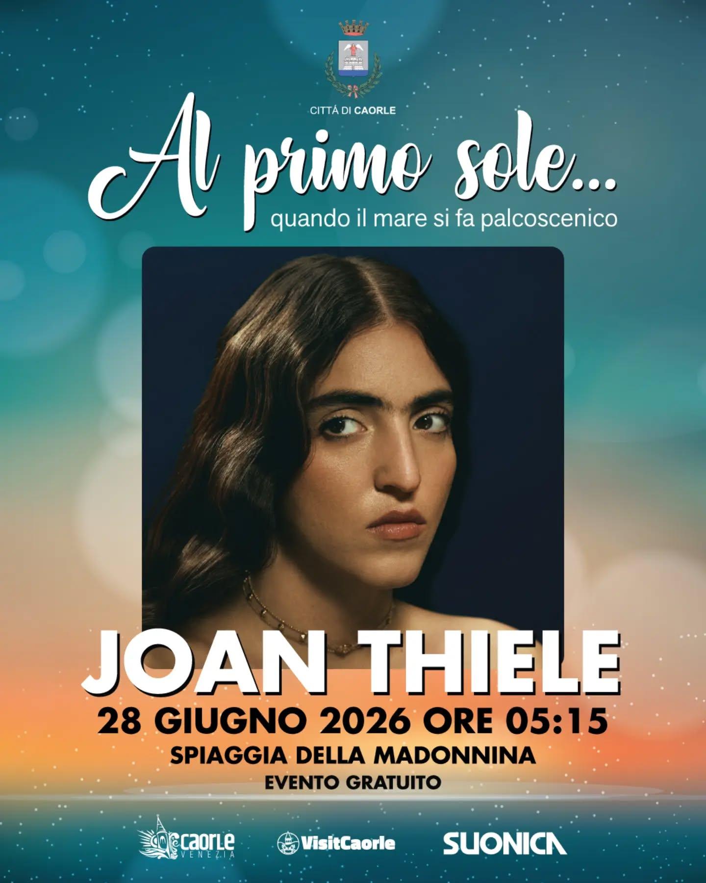 La spiaggia della Madonnina di Caorle farà da cornice a un suggestivo concerto all’alba con Joan Thiele. In uno dei luoghi più iconici della città, il pubblico potrà vivere un’esperienza speciale: la musica che si diffonde sulla battigia mentre il sole sorge lentamente sull’Adriatico.