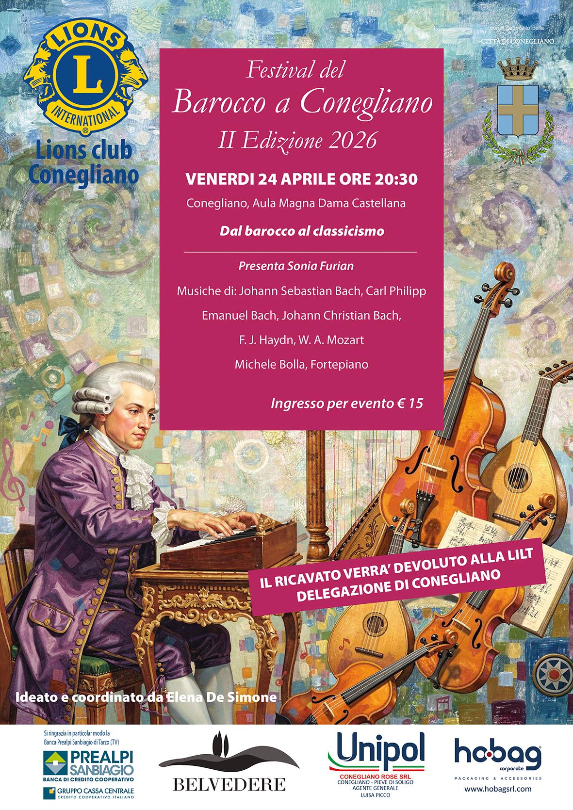 Il Lions Club Conegliano promuove la II Edizione 2026 del Festival del Barocco, un appuntamento che intreccia la grande tradizione musicale del Settecento con la solidarietà. La rassegna, ideata e coordinata da Elena De Simone, celebra l'eleganza del repertorio barocco offrendo un'esperienza culturale di alto livello.