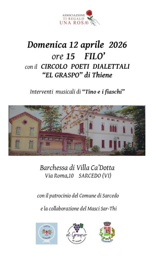 Domenica 12 aprile 2026, si terrà, alle ore 15:00 presso la Barchessa di Villa Ca' Dotta a Sarcedo, il Filò Dialettale con il Circolo Poeti "El Graspo" di Thiene.