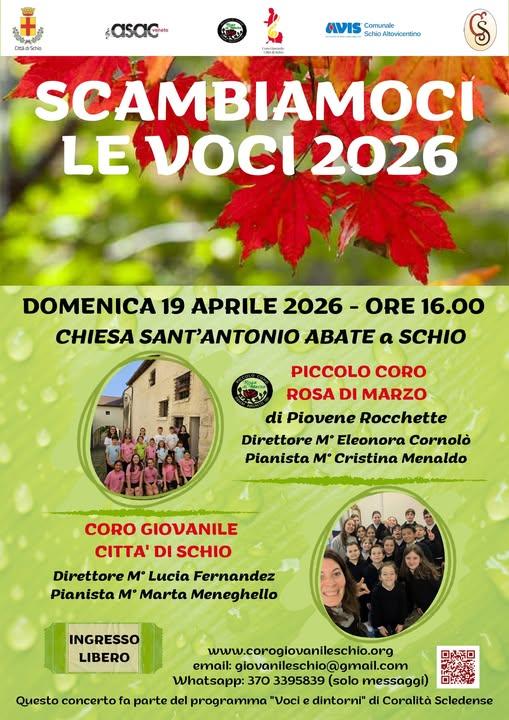 Domenica 19 aprile 2026 alle ore 16:00 presso la Chiesa di Sant'Antonio Abate di Schio, si terrà un concerto che fa parte del programma "Voci e dintorni" di Coralità Scledense.