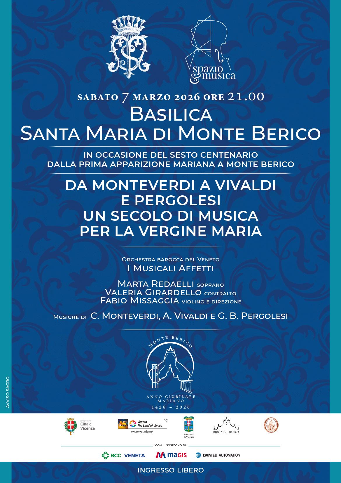Il 7 marzo si celebra il sesto centenario della prima apparizione della Madonna a Monte Berico, un momento di straordinaria importanza per tutta la comunità vicentina e non solo. Una data dal così alto significato spirituale meritava un appuntamento musicale di grande rilievo, promosso dall’Ordine dei Servi di Maria, in collaborazione con il festival Spazio&Musica. Il concerto dal titolo “Da Monteverdi a Vivaldi e Pergolesi, un secolo di musiche per la Vergine Maria” si terrà in Basilica alle ore 21.00.