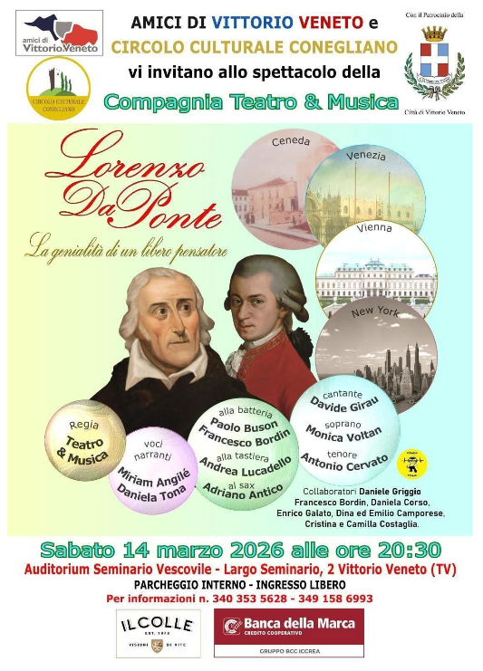 Amici di Vittorio Veneto e Circolo Culturale Conegliano vi invitano allo spettacolo "Lorenzo Da Ponte. La genialità di un libero pensatore" a cura della Compagnia Teatro & Musica.