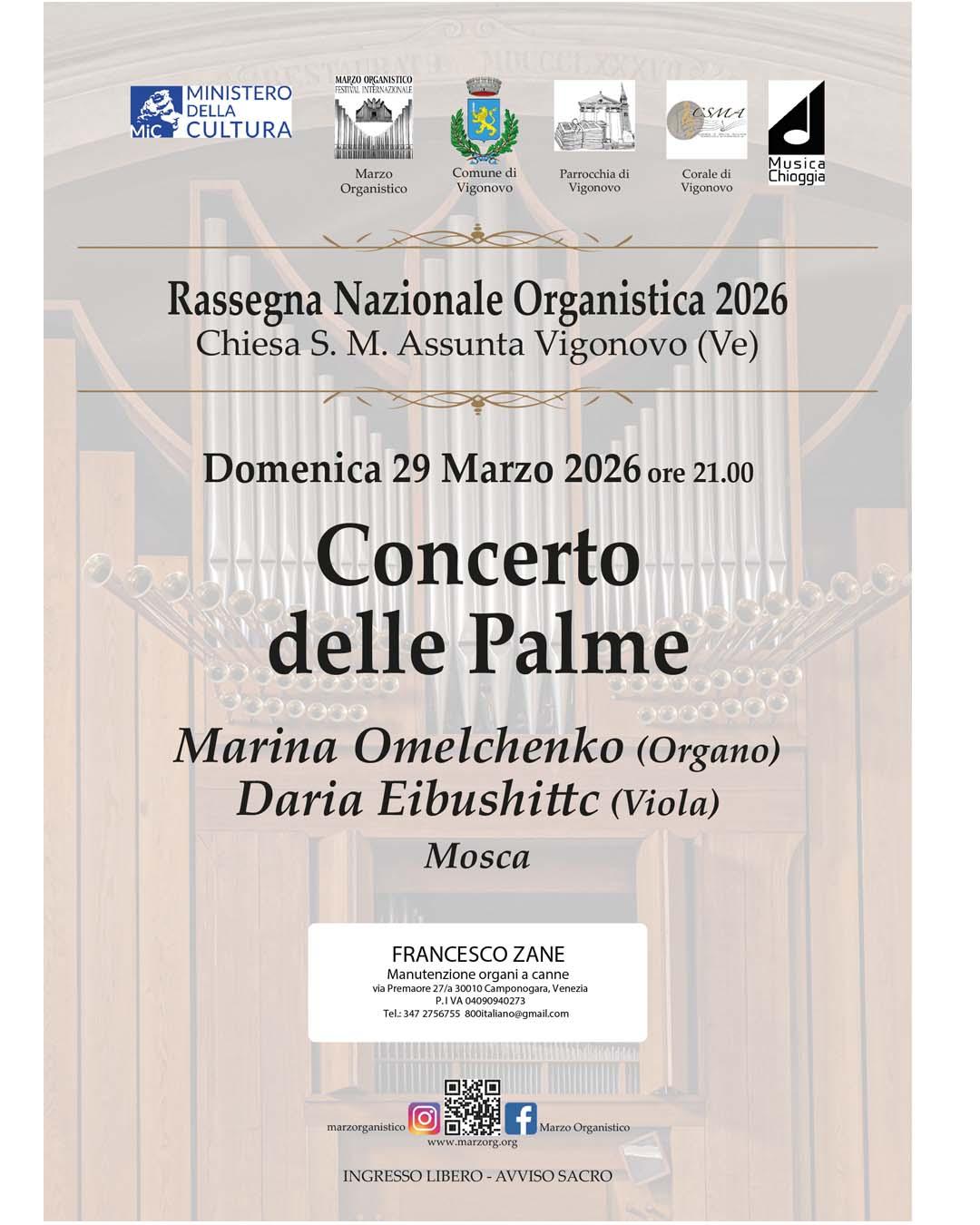 Domenica 29 marzo 2026 alle ore 21.00, nella chiesa di S. Maria Assunta di Vigonovo, la Rassegna Nazionale Organistica 2026 ospiterà il Concerto delle Palme, un appuntamento musicale di grande suggestione che unisce tradizione sacra e repertorio concertistico.
