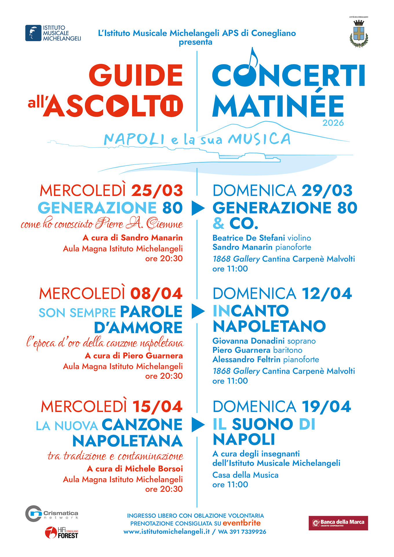 Con gli insegnanti dell’Istituto Musicale Michelangeli APS ci troveremo in un batter d’occhio a Napoli in compagnia di Pino Daniele, Roberto Murolo e Renato Carosone. Il concerto avrà luogo presso la Casa della Musica, alle ore 11.00.