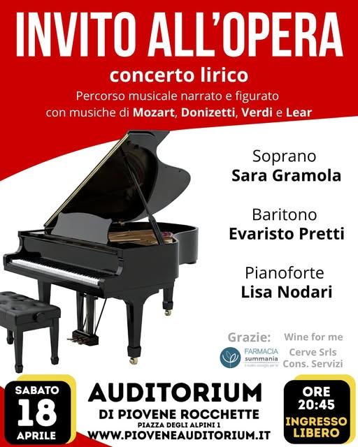 Sabato 18 aprile 2026 alle or 20:45 presso l'Auditorium di Piovene Rocchette si terrà un concerto lirico.