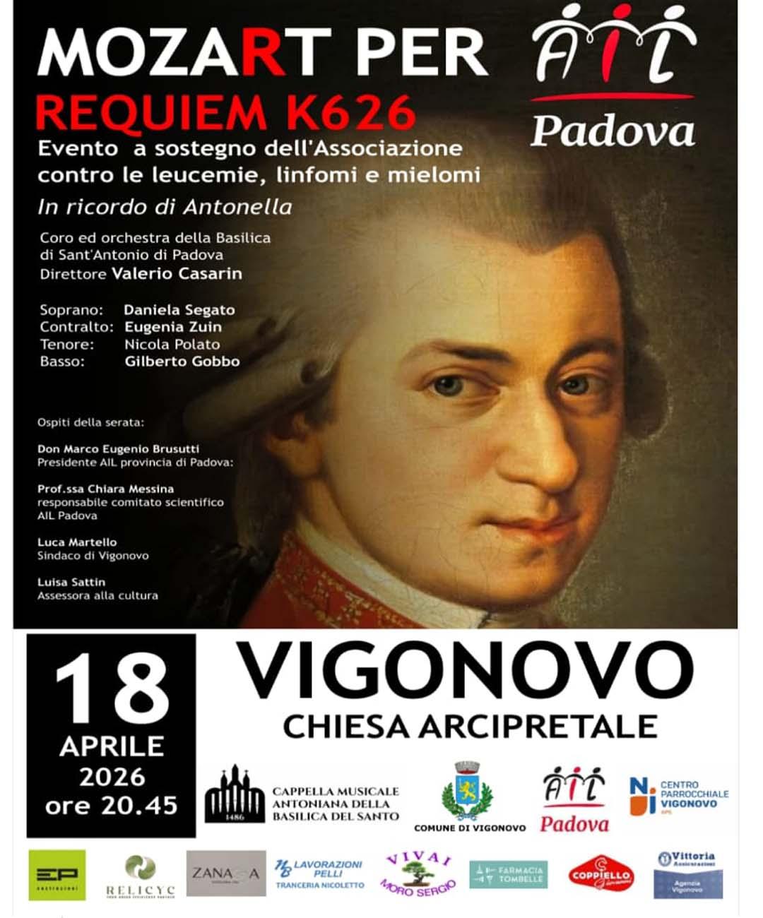 Sabato 18 aprile, nella chiesa arcipretale di Vigonovo, il Requiem K626 di Mozart risuonerà per sostenere AIL e la ricerca contro leucemie, linfomi e mielomi.