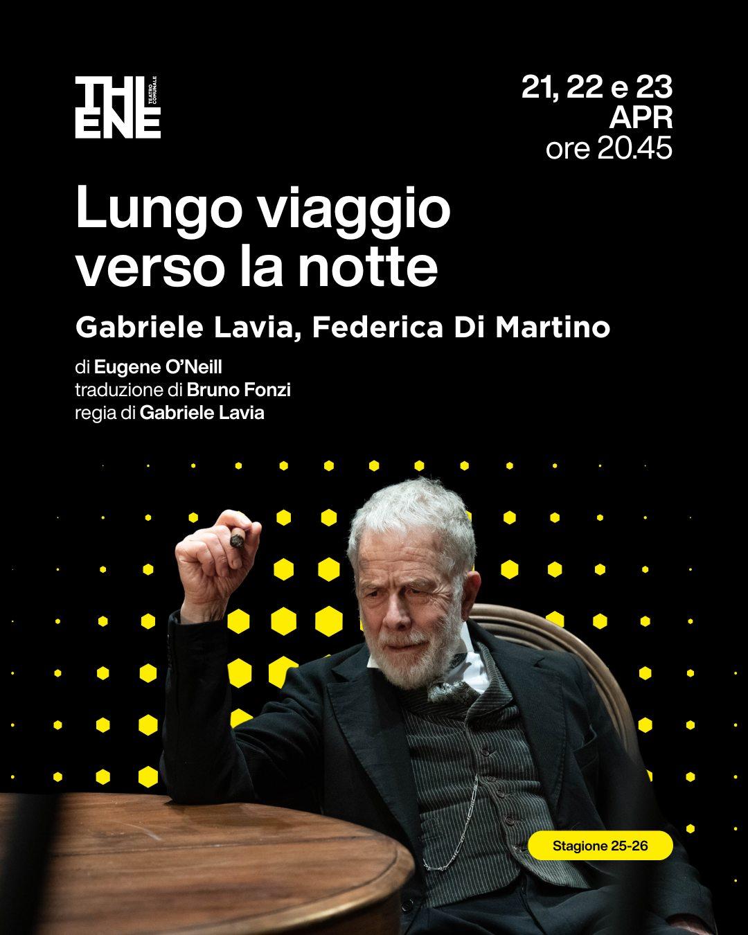 Dal 21 al 23 aprile alle ore 20.45 presso il Teatro Comunale di Thiene, andrà in scena "Lungo viaggio verso la notte" di Eugene O'Neill, con Gabriele Lavia e Federica Di Martino, insieme a Jacopo Venturiero, Ian Gualdani e Beatrice Ceccherini.