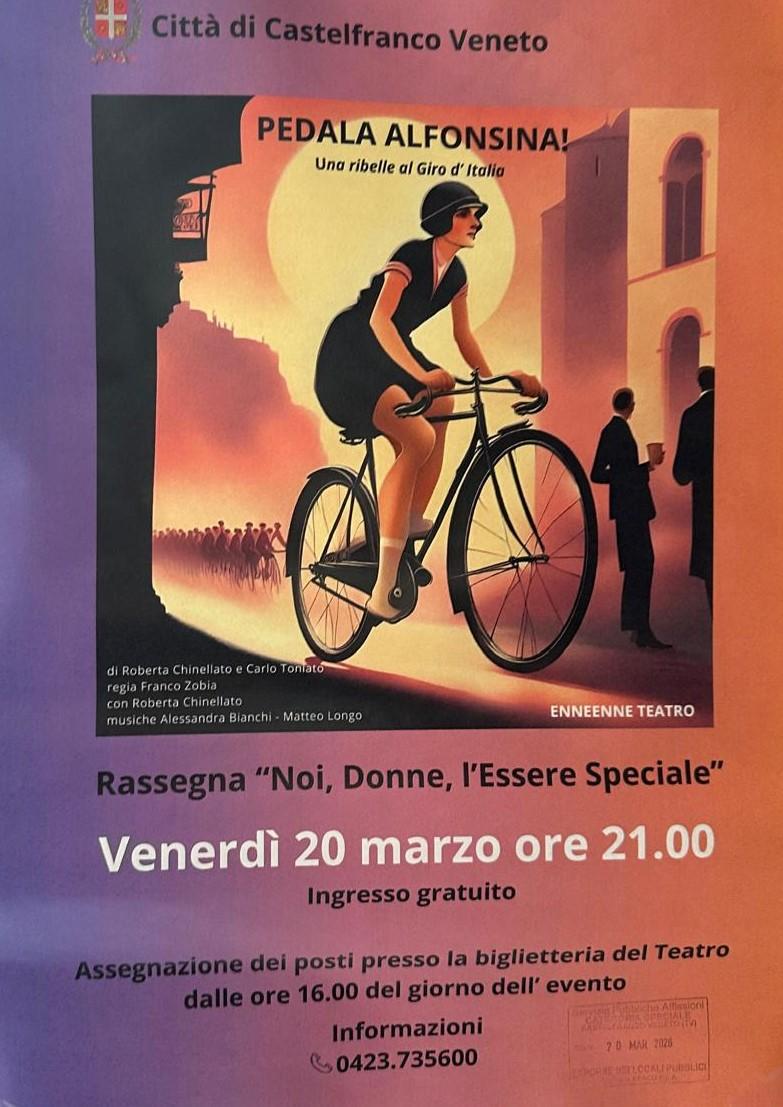 All'interno della rassegna "Noi, Donne, l'Essere Speciale", la Città di Castelfranco Veneto presenta uno spettacolo teatrale dedicato alla straordinaria storia di Alfonsina Strada. Una serata per celebrare la forza e la determinazione di una donna che ha sfidato le convenzioni in sella alla sua bicicletta.