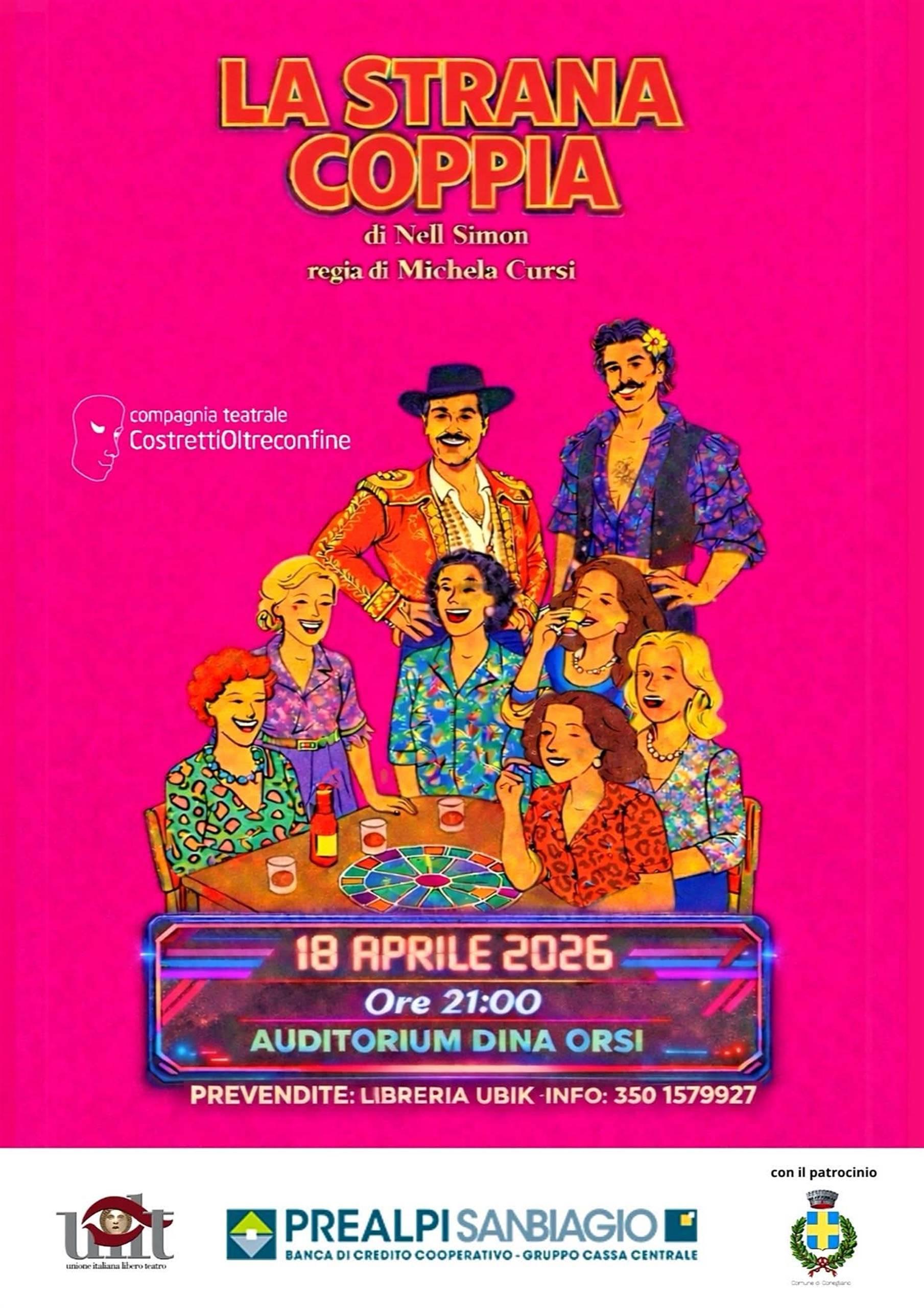 Sabato 18 aprile la Compagnia Teatrale Costretti Oltreconfine porta in scena “La strana coppia”, celebre commedia brillante di Neil Simon, presso l’Auditorium Dina Orsi di Conegliano.