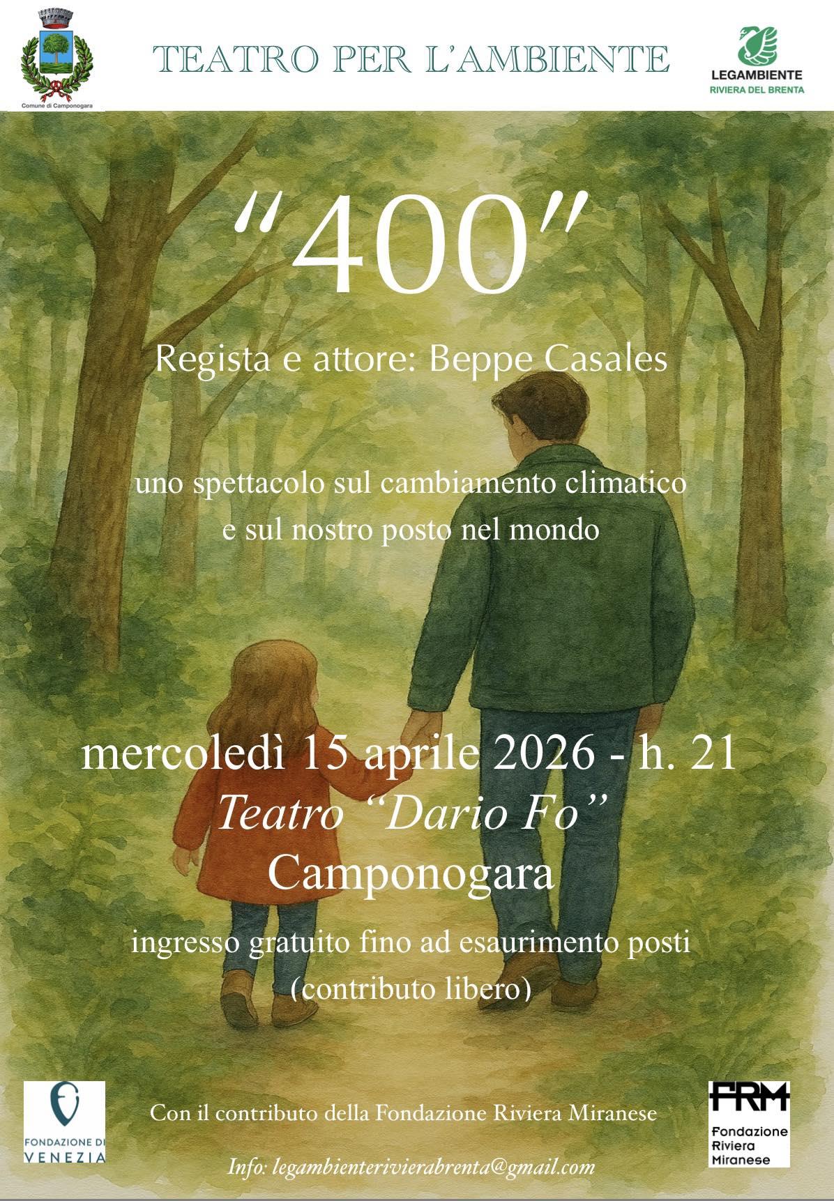 L'Assessorato alla Cultura e l'Assessorato all'Ambiente con il contributo della Fondazione Riviera Miranese e la collaborazione di Legambiente Riviera del Brenta invitano i cittadini a "400" con il regista e attore Beppe Casales.